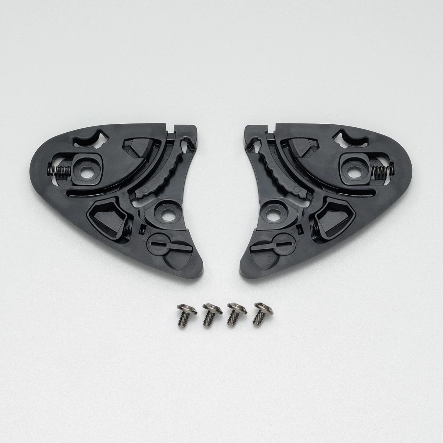 Replacement base plate set for Shoei RF-1400 helmets. Sold as a pair. Four screws are included.